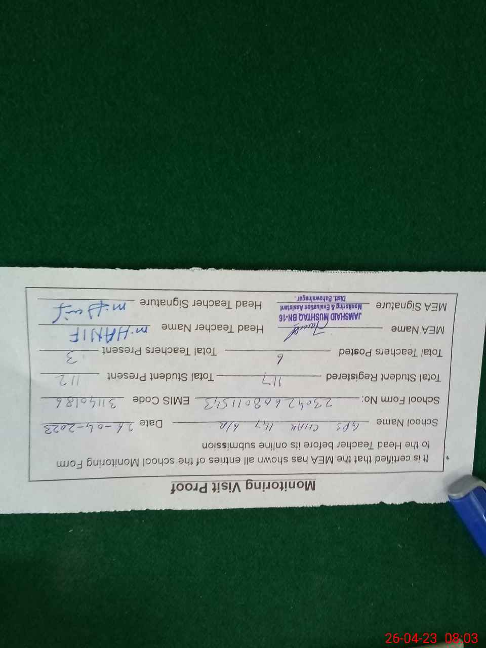 | Monitoring Date: 26-04-2023 | Start Time: 26-04-2023 07:44 AM | End Time: 26-04-2023 08:04 AM | Name of MEA: Ja**** Mu**** BN**** | |