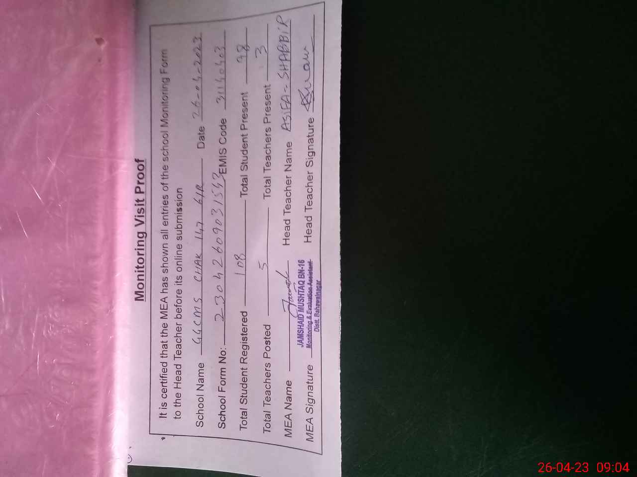 | Attendance Register | Head Teacher | MEA with School | Visit Proof |