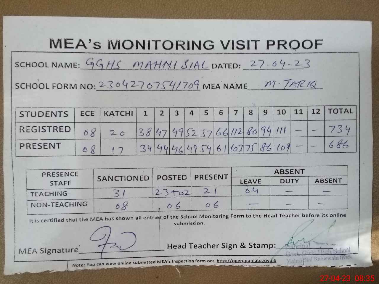 | Attendance Register | Head Teacher | MEA with School | Visit Proof |
