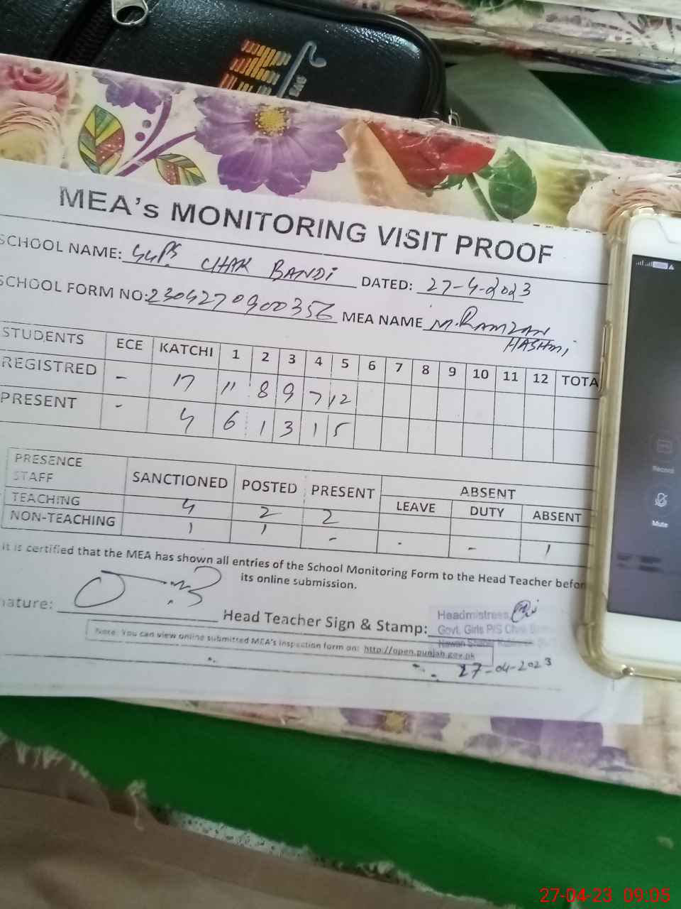 | Attendance Register | Head Teacher | MEA with School | Visit Proof |
