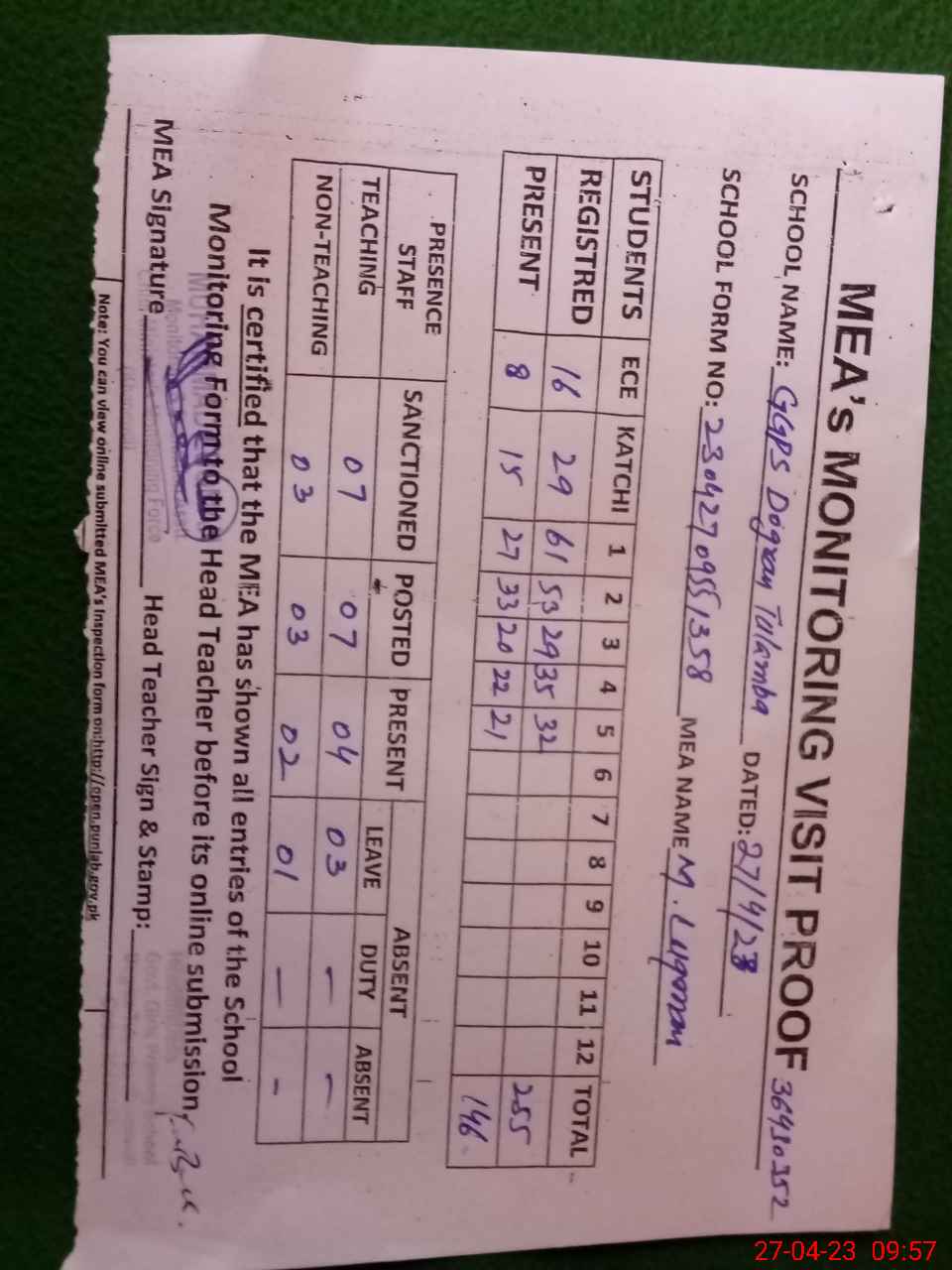 | Attendance Register | Head Teacher | MEA with School | Visit Proof |