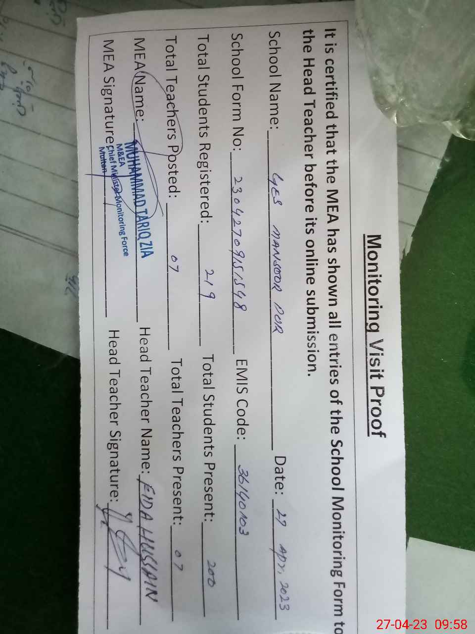 | Attendance Register | Head Teacher | MEA with School | Visit Proof |
