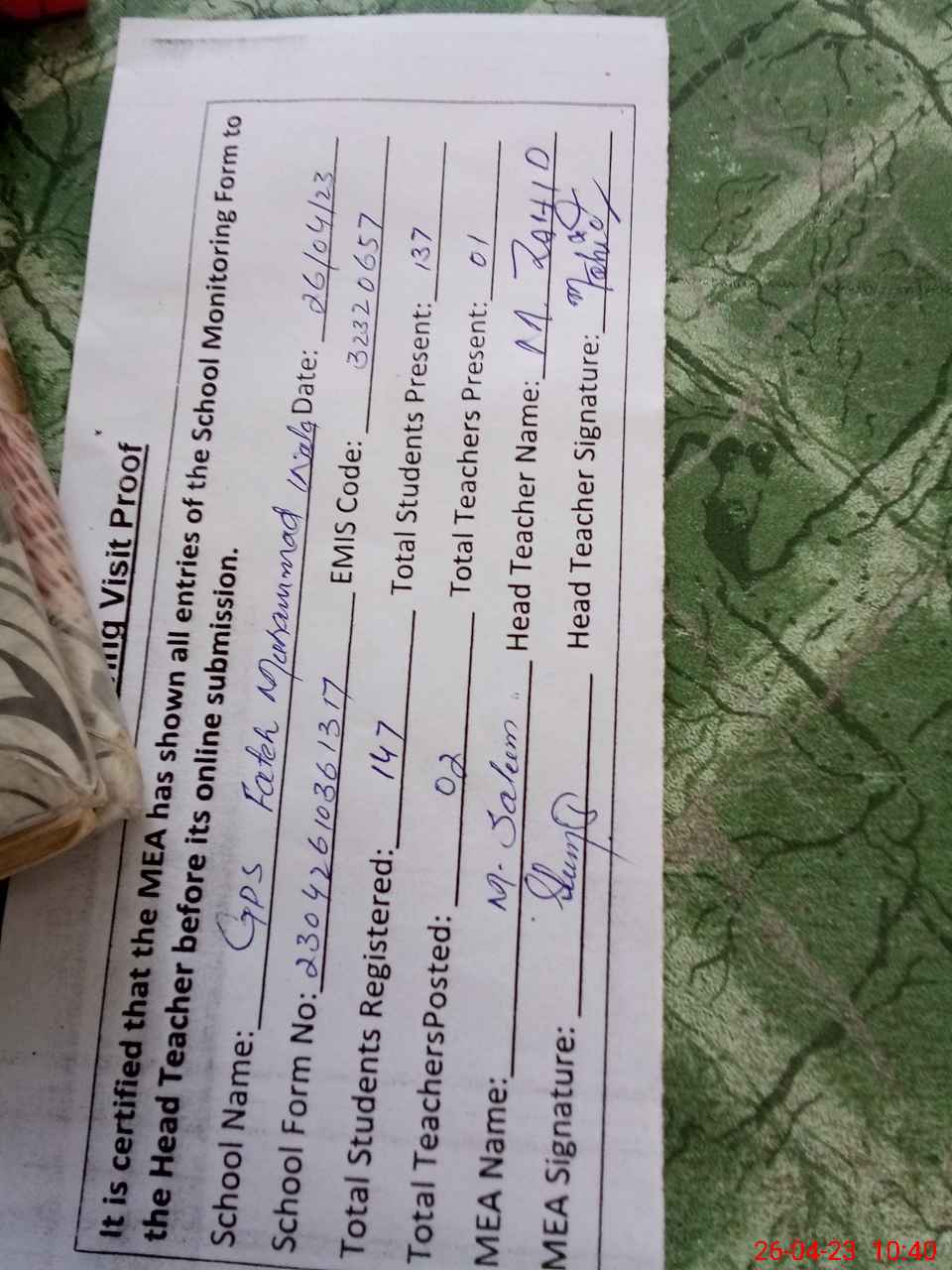 | EMIS Code: 32320657 | Name of School: GPS FATEH MUHAMMAD WALA | |||