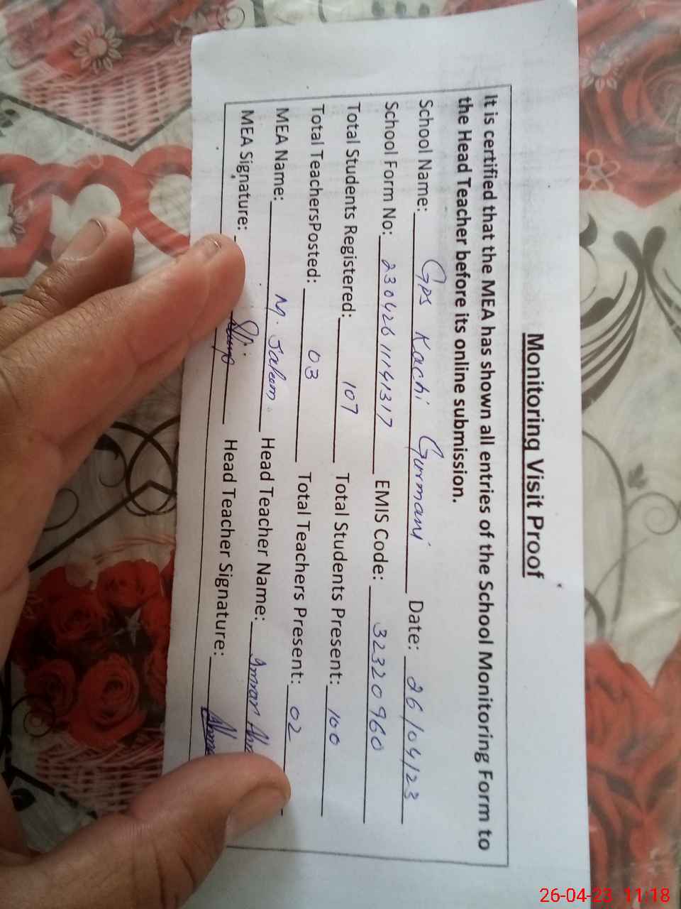 | Attendance Register | Head Teacher | MEA with School | Visit Proof |