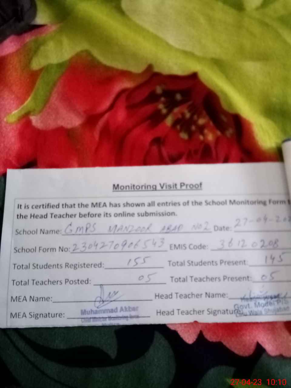 | EMIS Code: 36120208 | Name of School: GMPS MANZOOR ABAD NO. 2 | |||