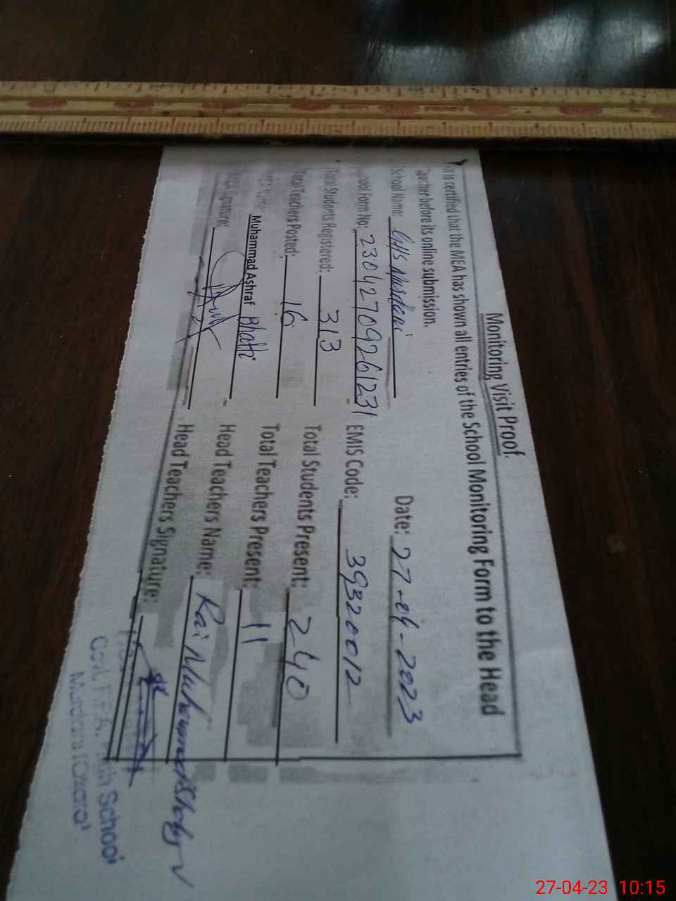 | Name: Ra**** Mu**** Sh**** Designation: (School Headmaster's/Headmistress's) HEADMASTER Phone/Cell Number: 03**** |