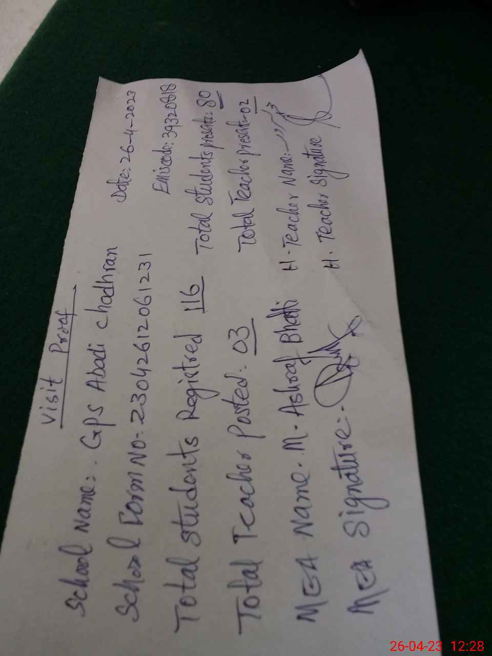 | Attendance Register | Head Teacher | MEA with School | Visit Proof |