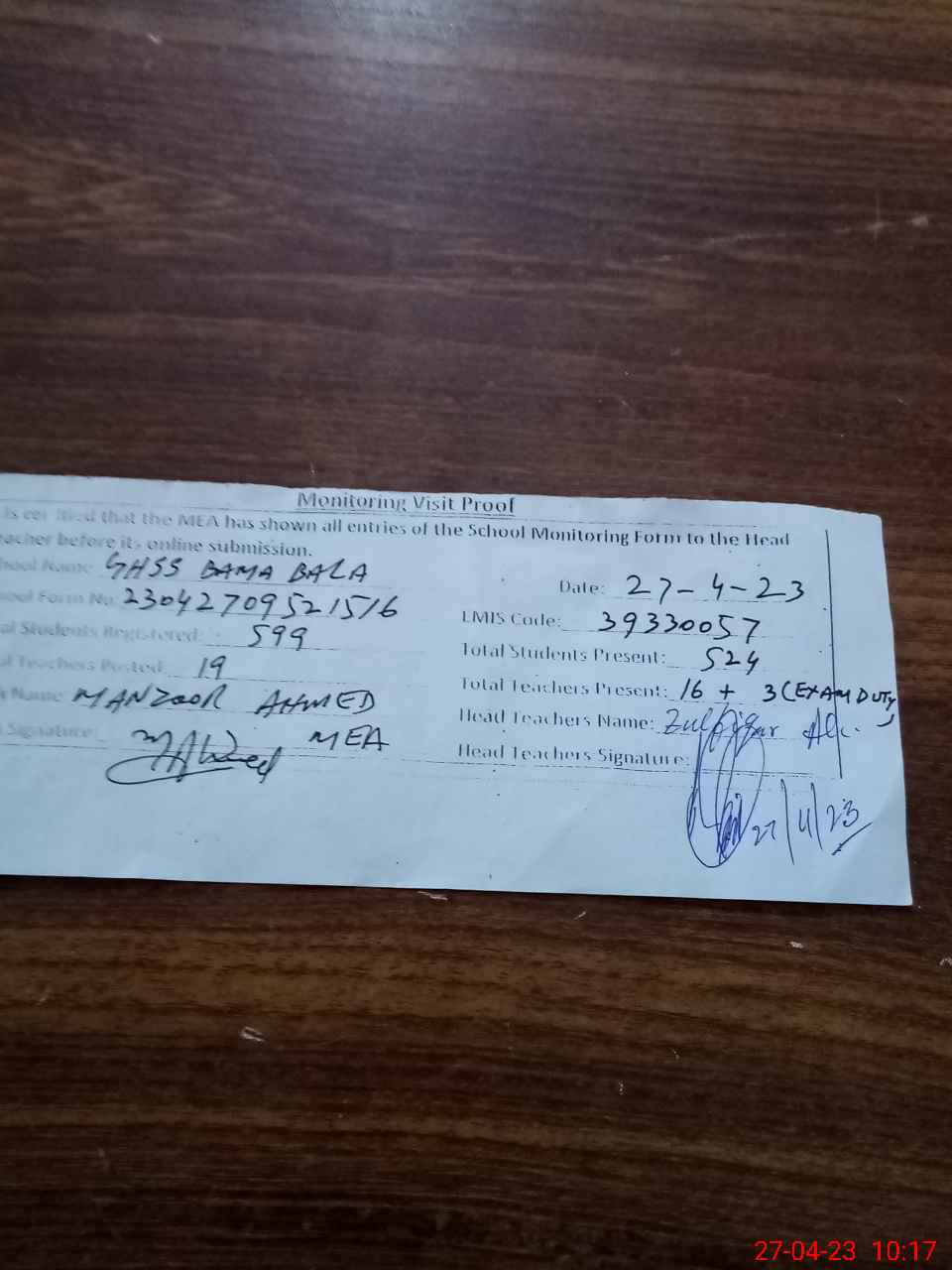 | Attendance Register | Head Teacher | MEA with School | Visit Proof |