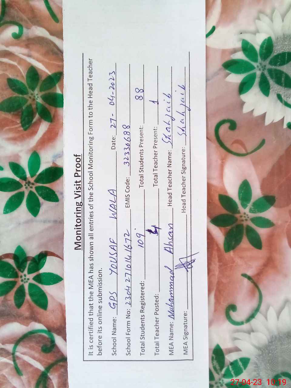 | Attendance Register | Head Teacher | MEA with School | Visit Proof |