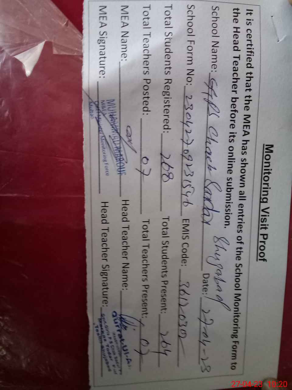 | EMIS Code: 36120302 | Name of School: GGPS CHAK SARDAR PUR TEH. SHUJABAD | |||