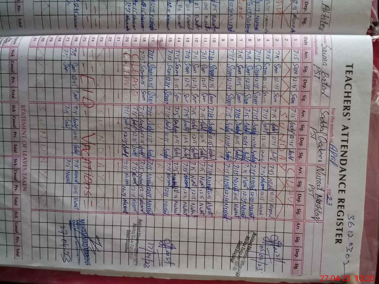 | Name: Sa**** Ba**** Designation: (School Headmaster's/Headmistress's) PST Phone/Cell Number: 03**** |