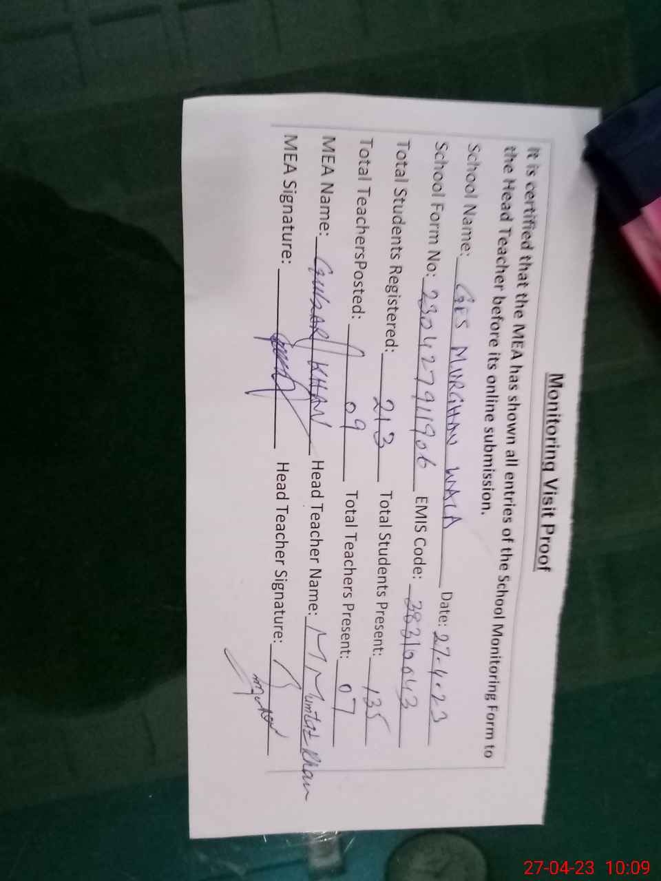 | Attendance Register | Head Teacher | MEA with School | Visit Proof |
