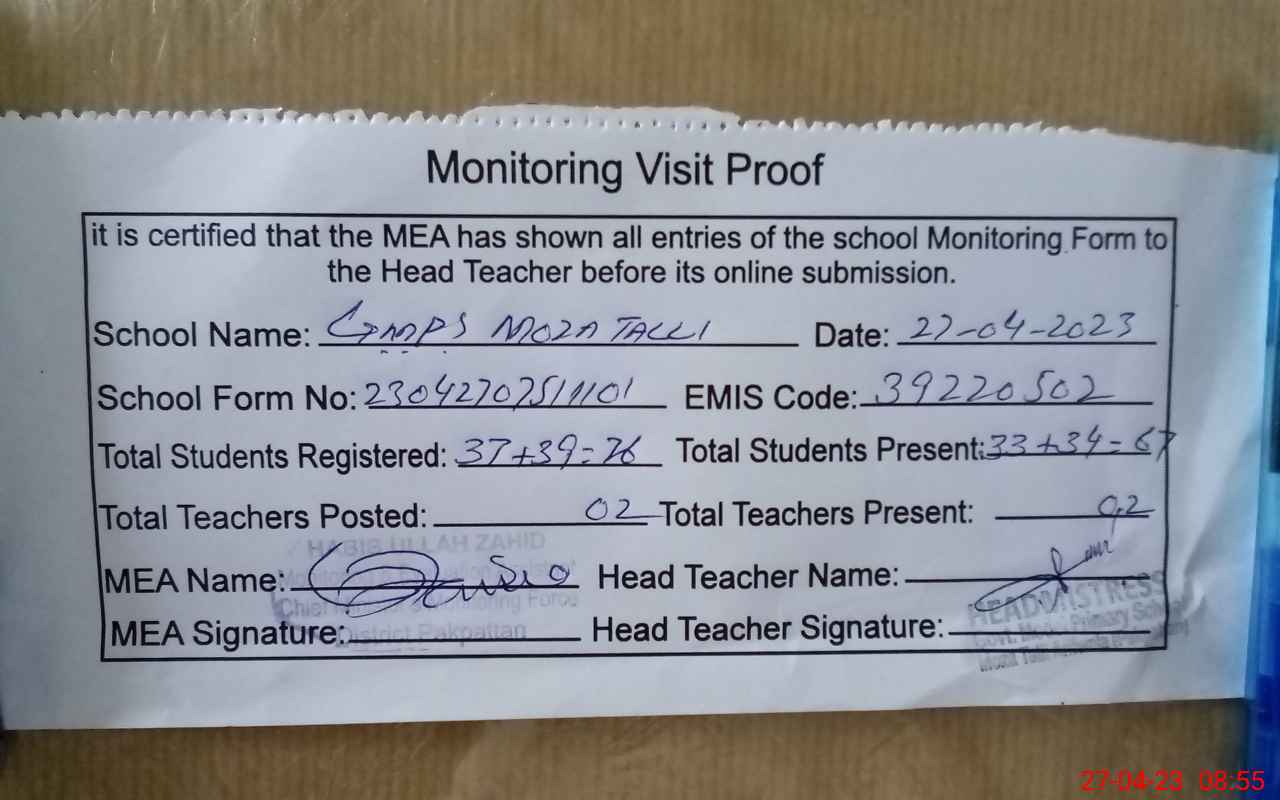 | EMIS Code: 39220502 | Name of School: GMPS MOZA TALLI | |||