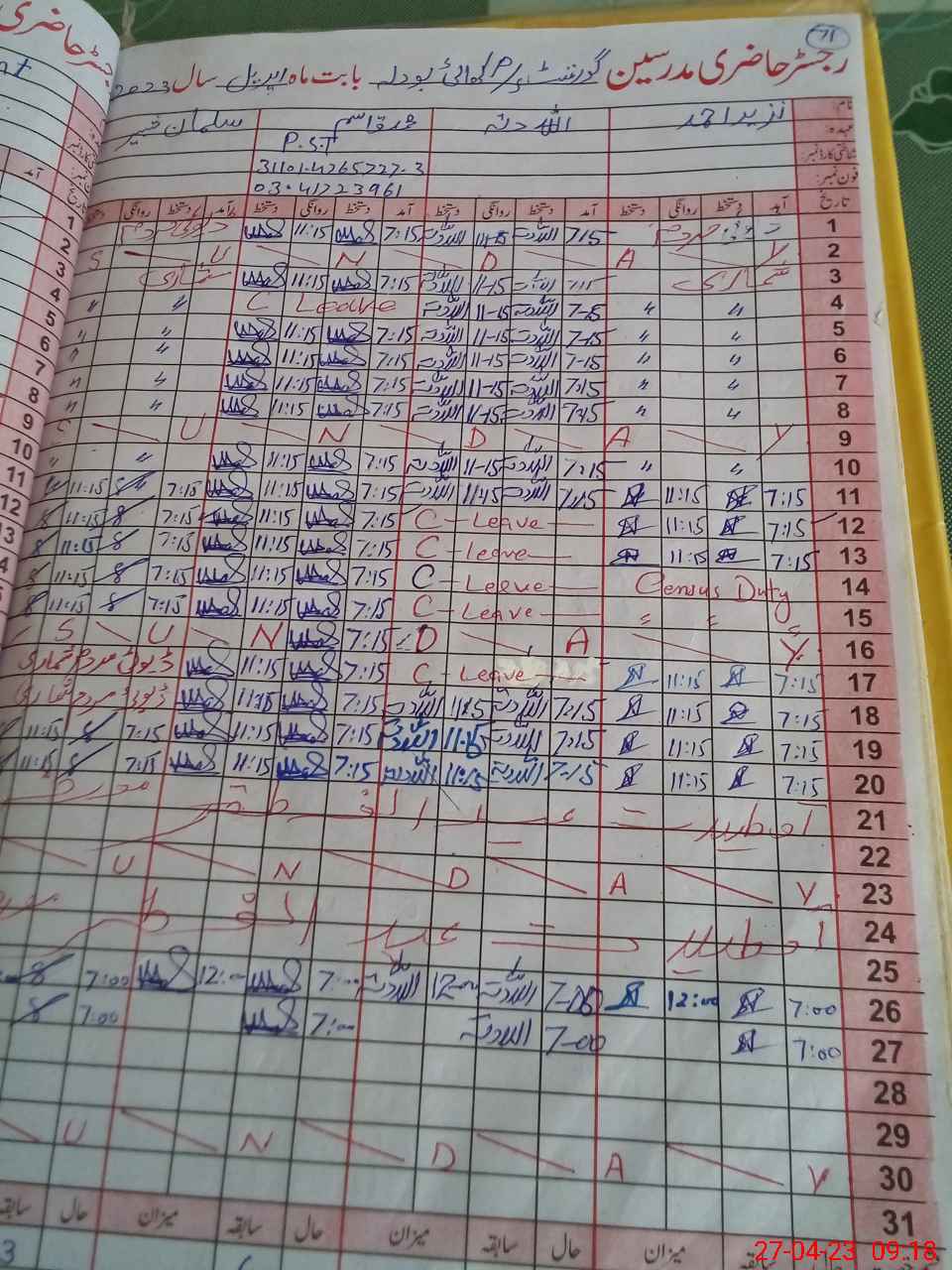 | CNIC | Full Name | Designation | R/C | Absence During Last Calender Month |
