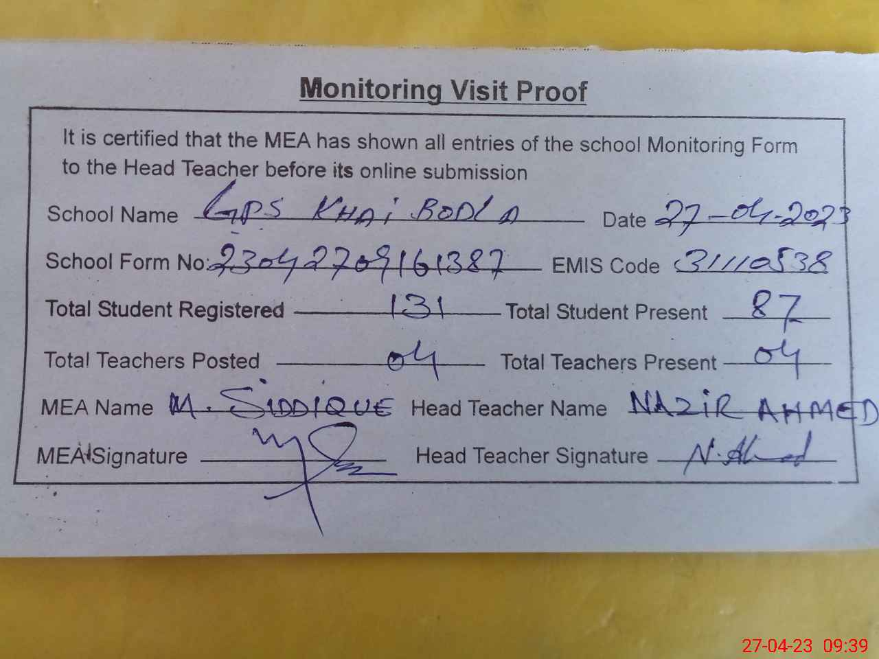 | Attendance Register | Head Teacher | MEA with School | Visit Proof |