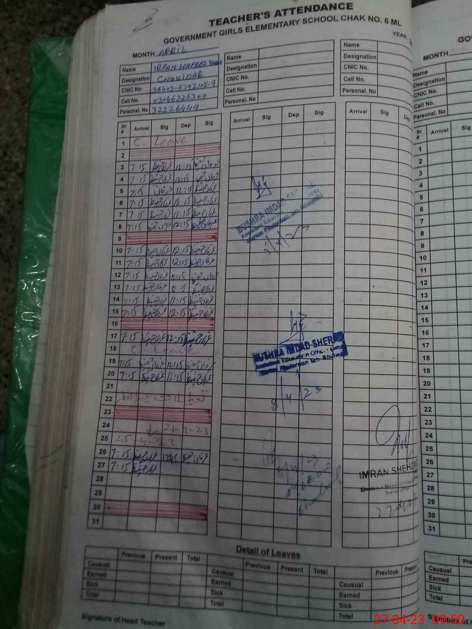 | CNIC | Full Name | Designation | R/C | Absence During Last Calender Month |