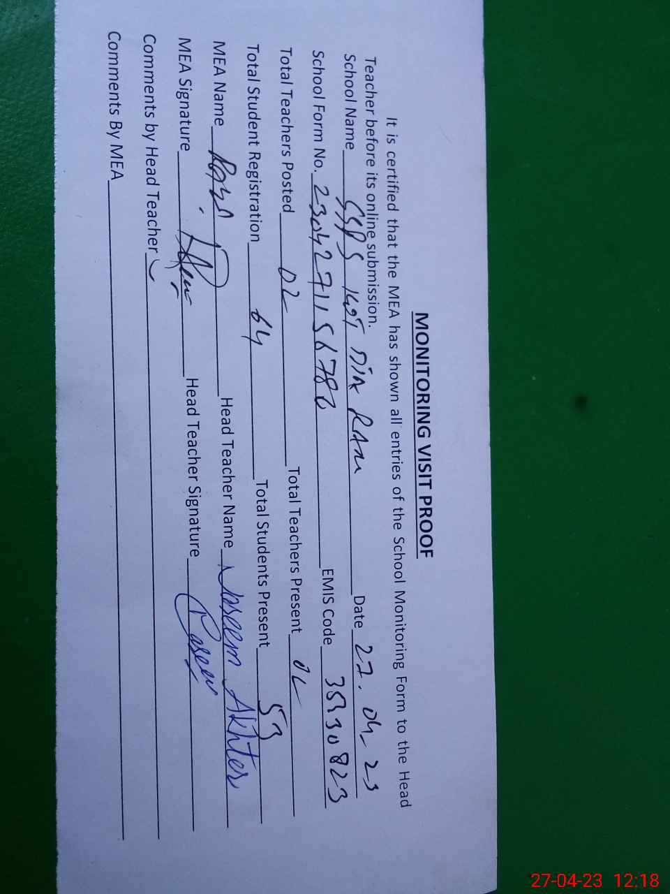 | EMIS Code: 35430823 | Name of School: GGPS KOT DIA RAM | |||