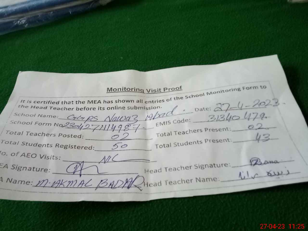 | Attendance Register | Head Teacher | MEA with School | Visit Proof |