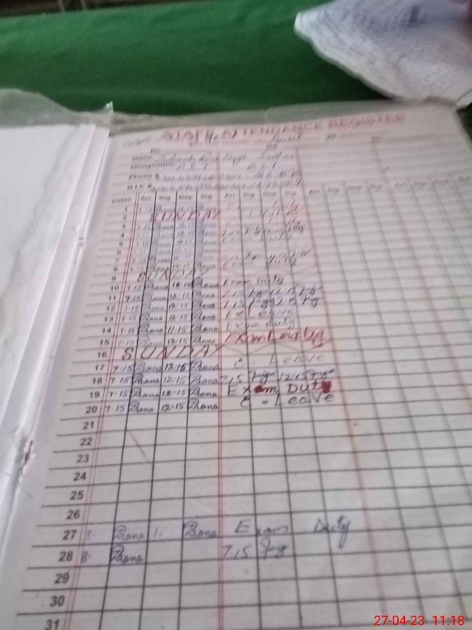 | Leave | Duty | Absent | Maternity | Medical | Ex- Pak |