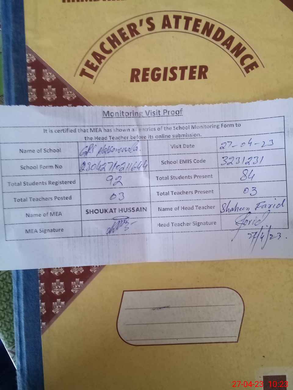 | Attendance Register | Head Teacher | MEA with School | Visit Proof |