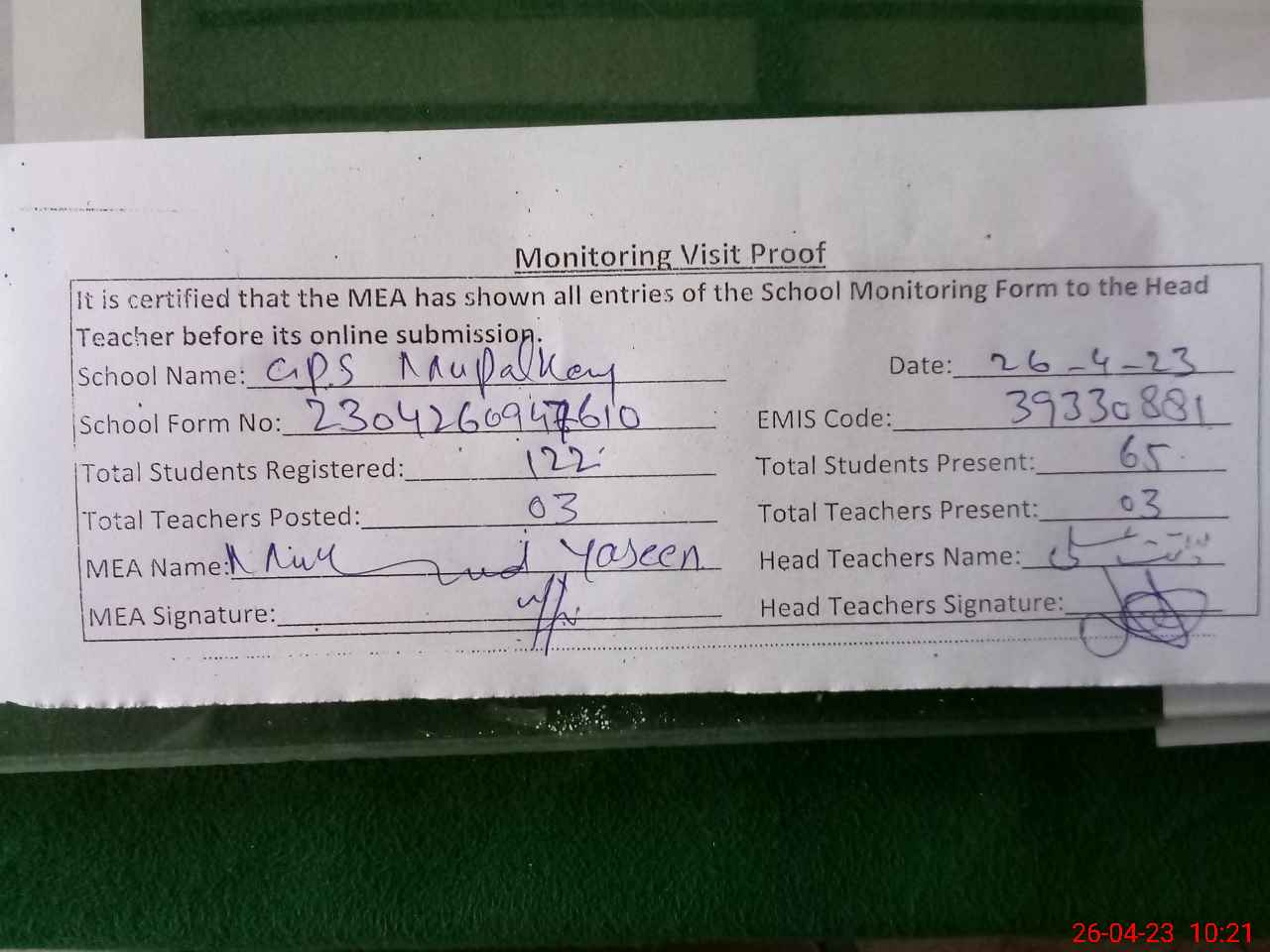 | Attendance Register | Head Teacher | MEA with School | Visit Proof |