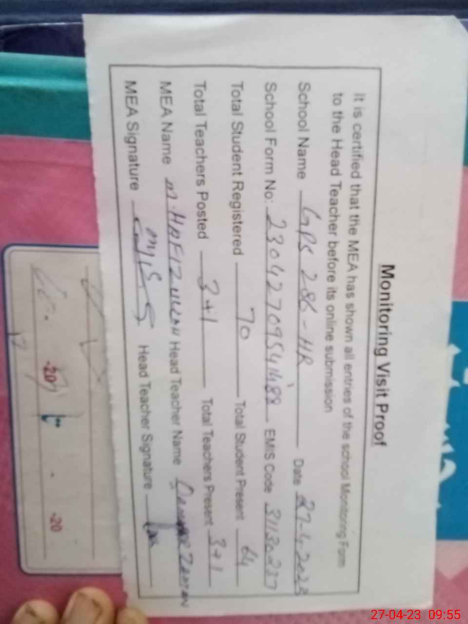 | Attendance Register | Head Teacher | MEA with School | Visit Proof |