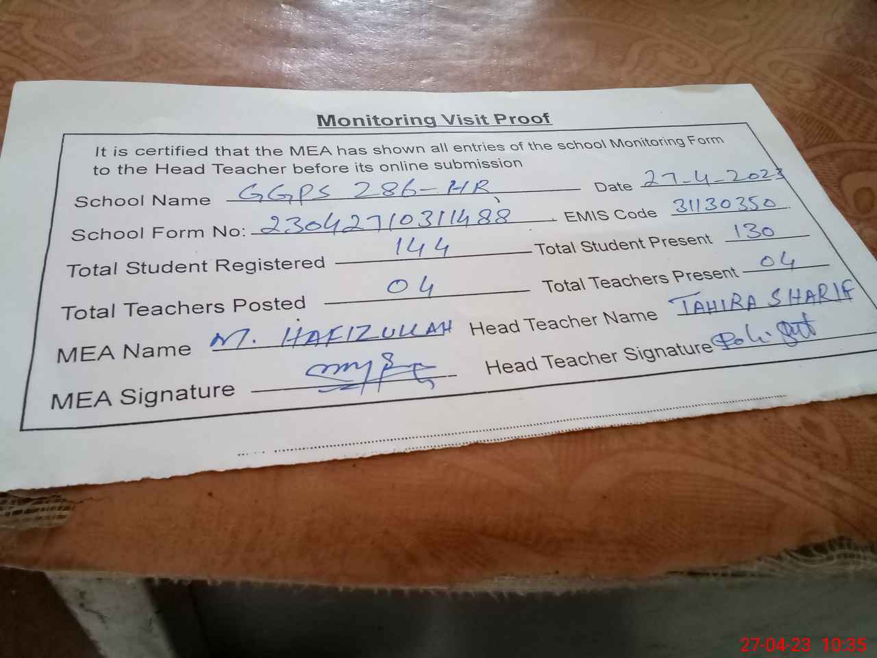 | Attendance Register | Head Teacher | MEA with School | Visit Proof |