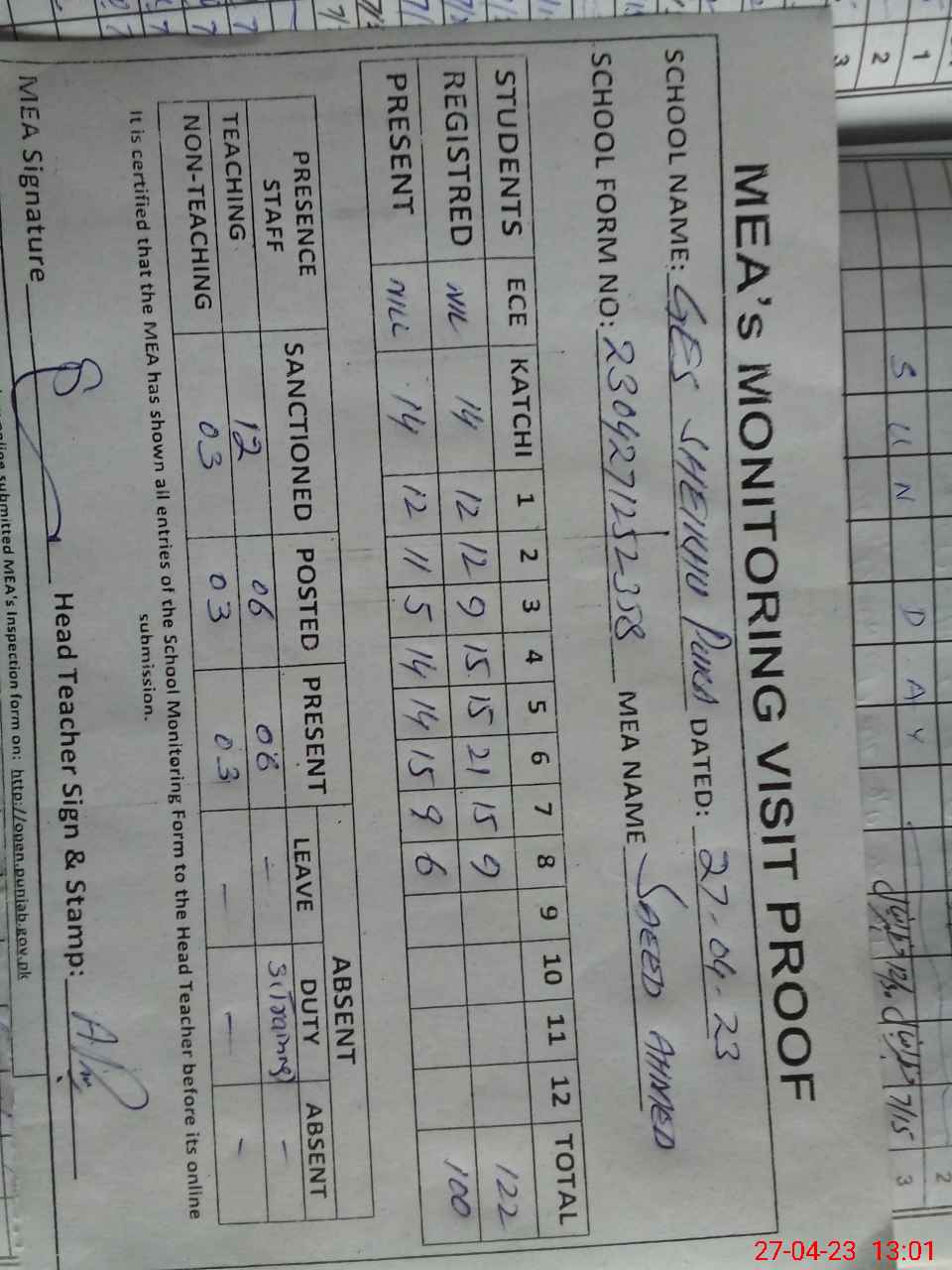 | Attendance Register | Head Teacher | MEA with School | Visit Proof |