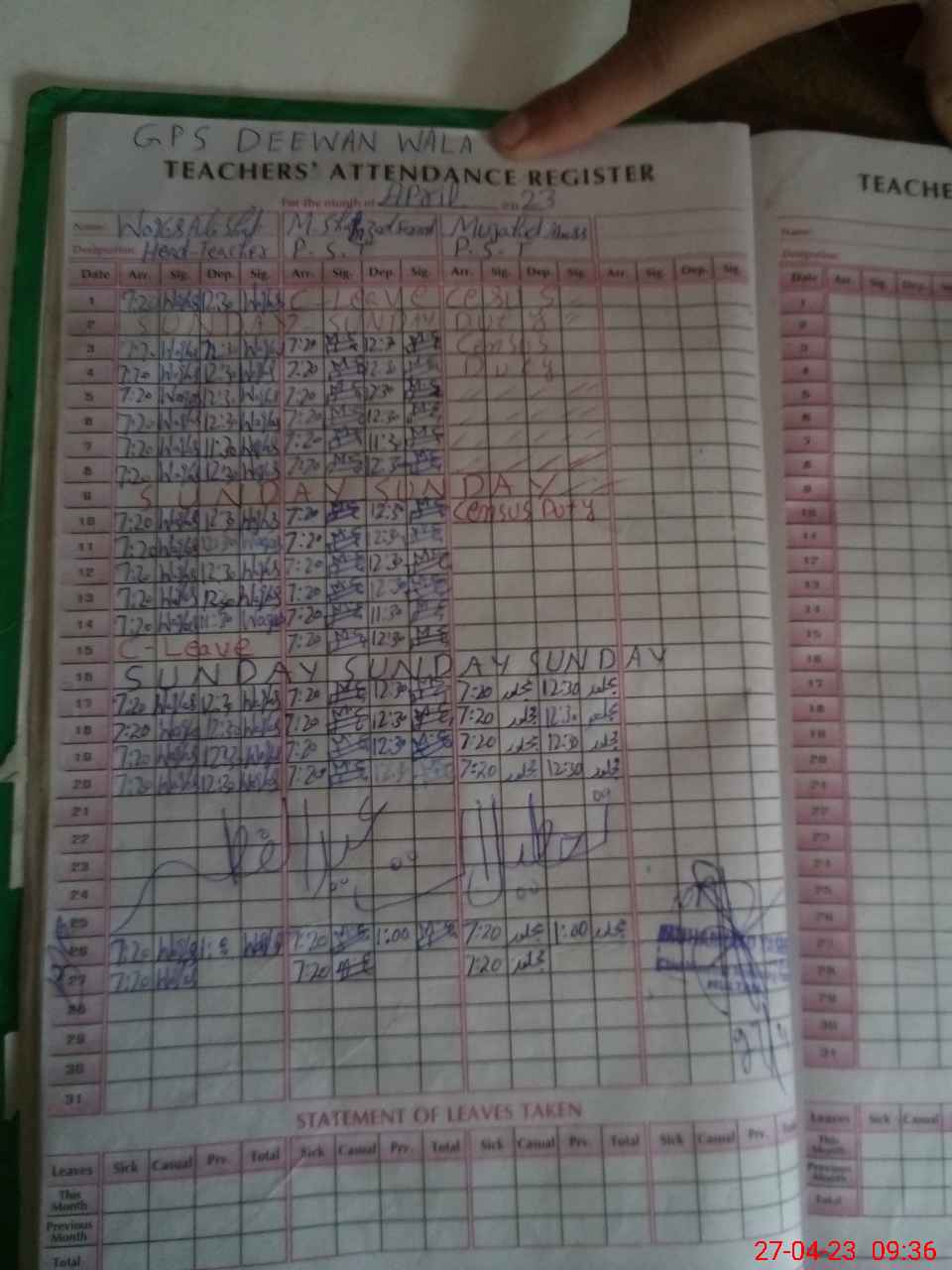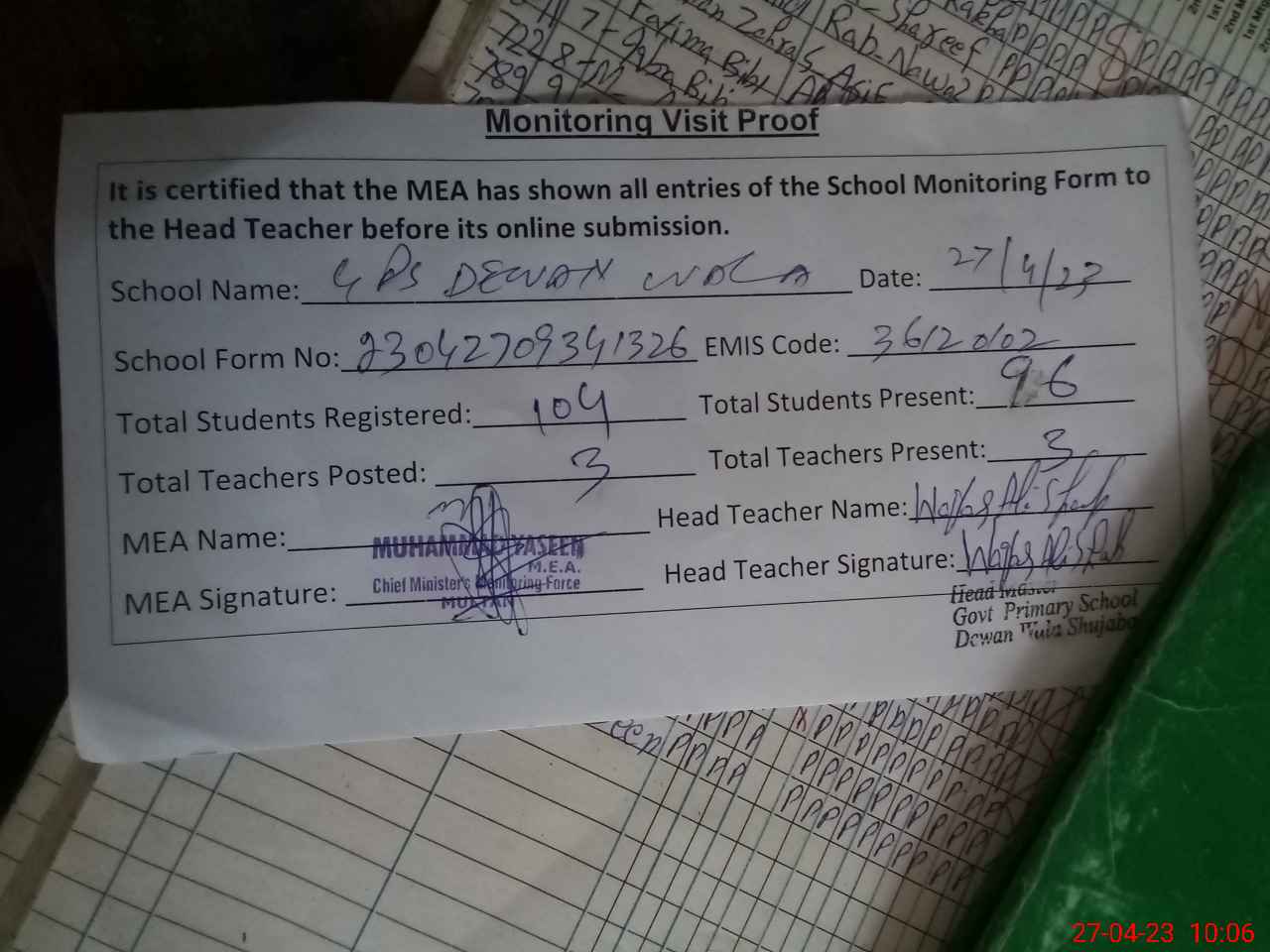 | Attendance Register | Head Teacher | MEA with School | Visit Proof |
