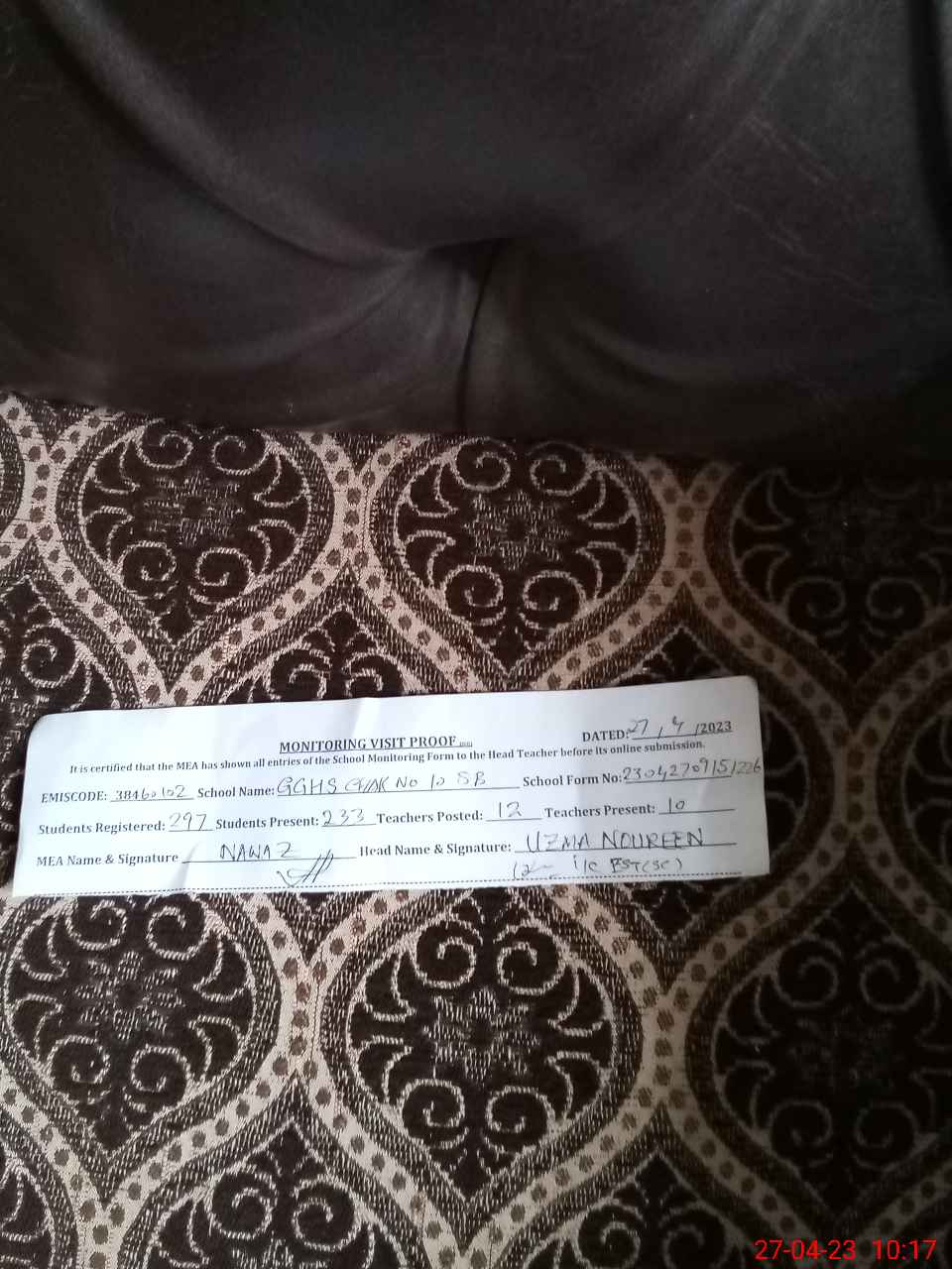 | Name: UZ**** BA**** Designation: (School Headmaster's/Headmistress's) SST (ARTS) Phone/Cell Number: 03**** |