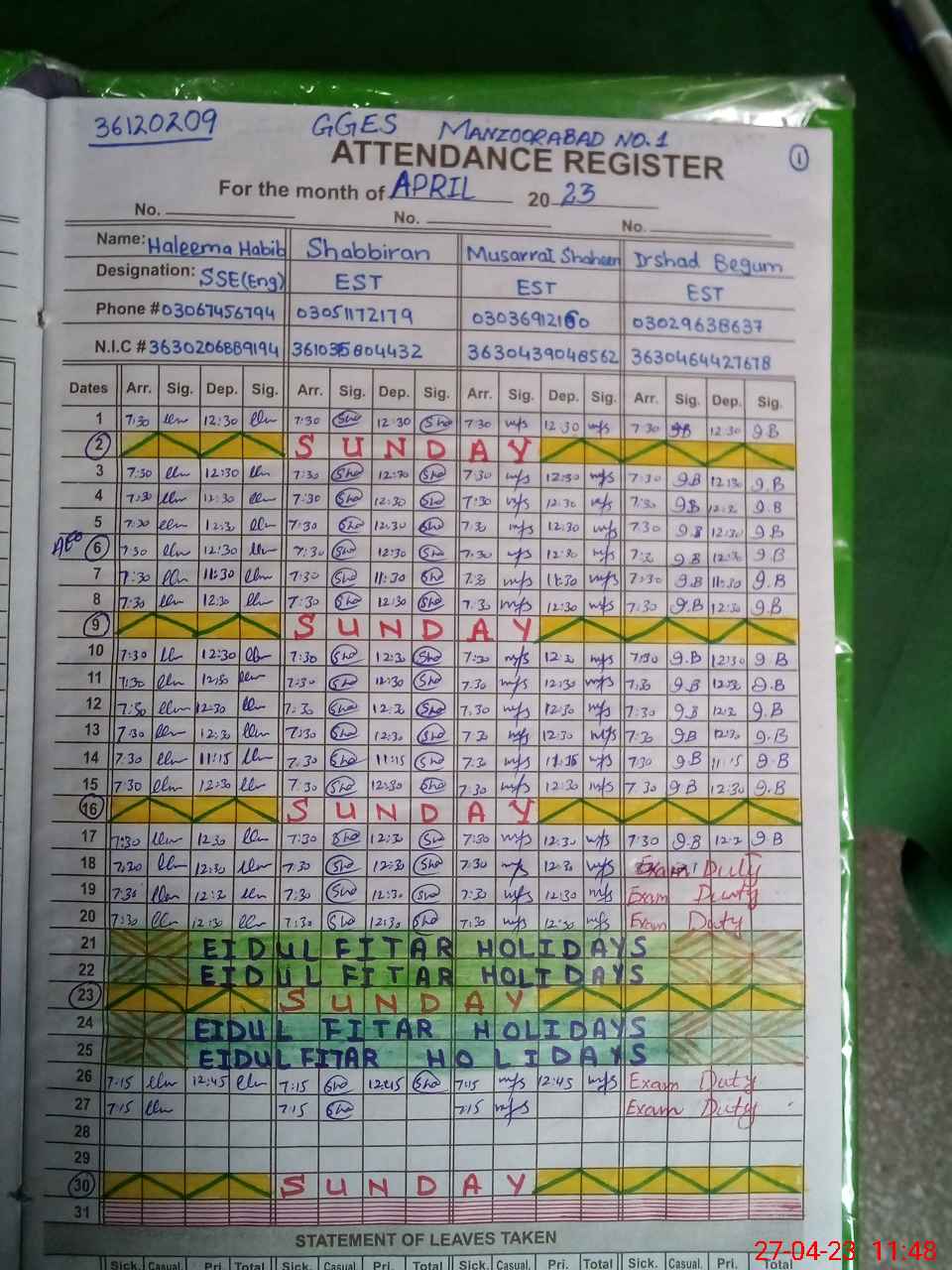 | 36**** | Ir**** Be**** | Regular | 3 | 0 | 0 | 0 | 0 | 0 | 0 | 0 | 3 | Exam Duty | |