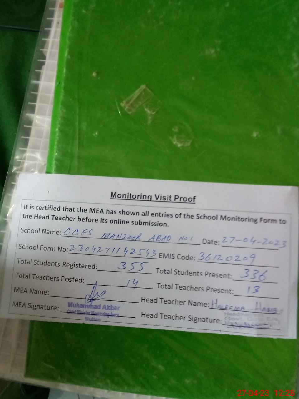 | Attendance Register | Head Teacher | MEA with School | Visit Proof |