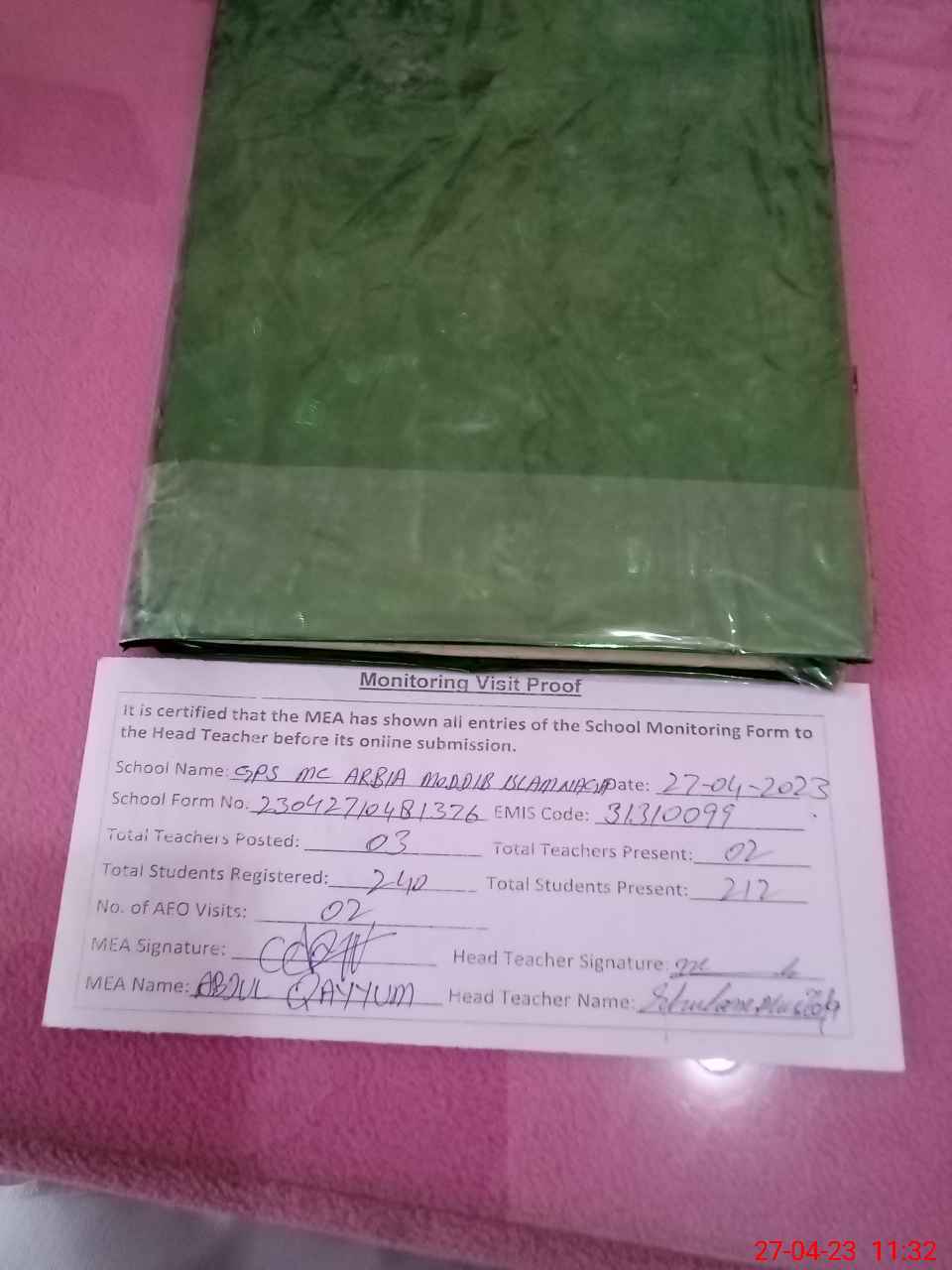 | EMIS Code: 31310099 | Name of School: GPS MC ARBIA MODDIB MOHALLA ISLAM NAGAR | |||