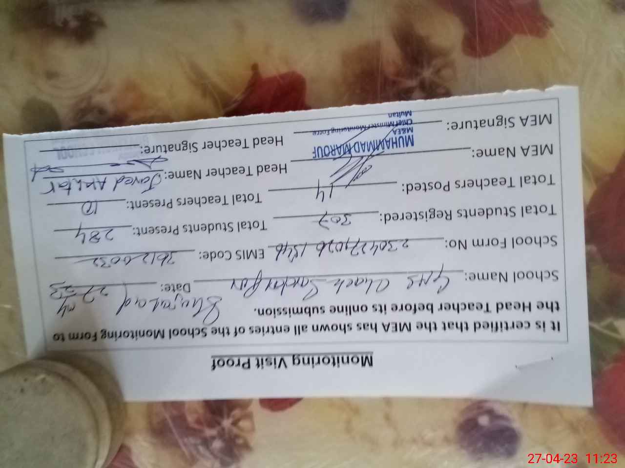 | Attendance Register | Head Teacher | MEA with School | Visit Proof |