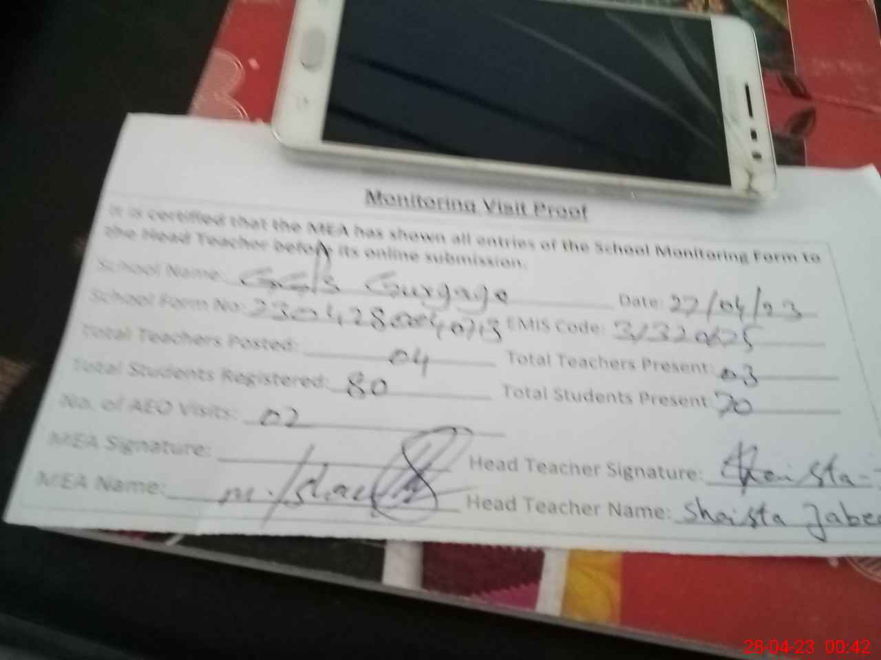 | Attendance Register | Head Teacher | MEA with School | Visit Proof |