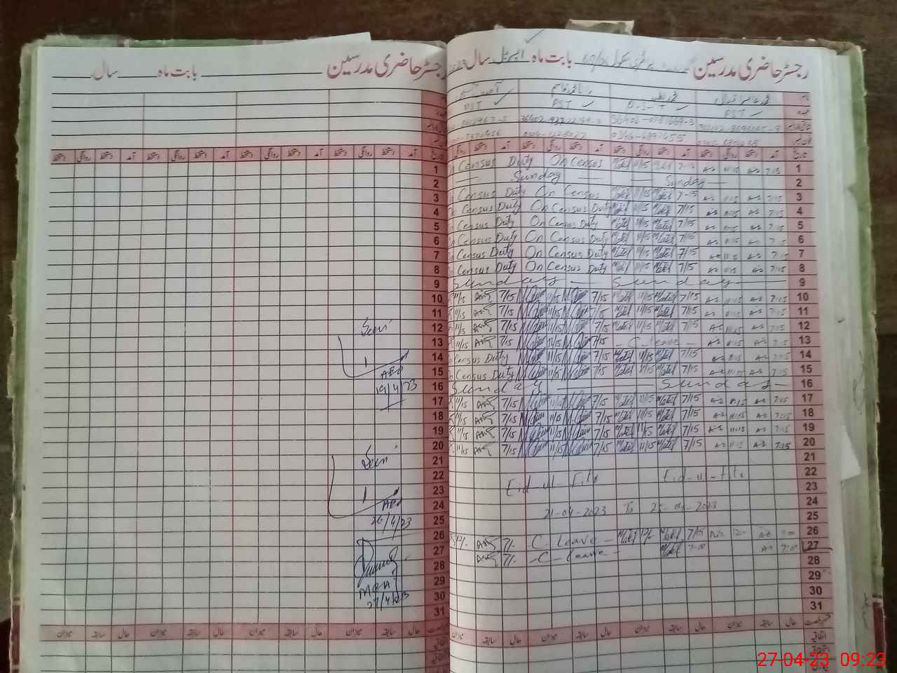 | CNIC | Full Name | Designation | R/C | Absence During Last Calender Month |