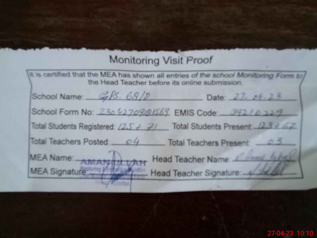 | Attendance Register | Head Teacher | MEA with School | Visit Proof |