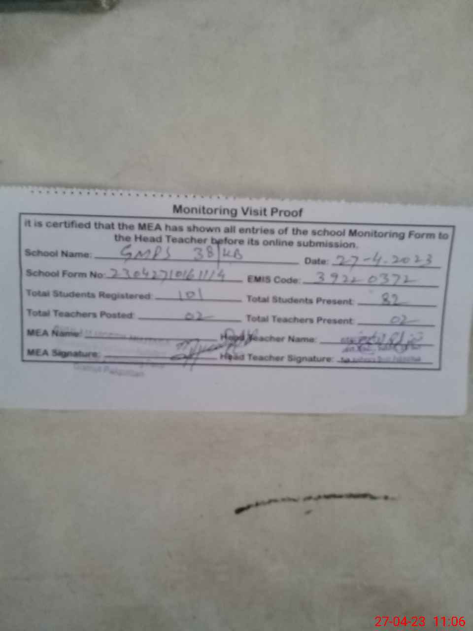 | Attendance Register | Head Teacher | MEA with School | Visit Proof |