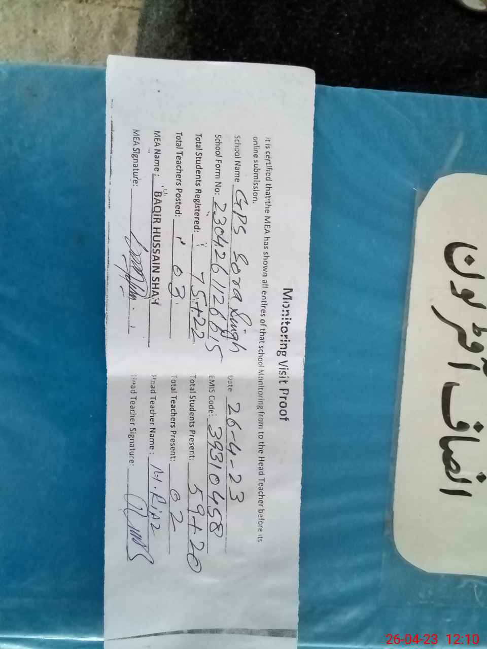 | Attendance Register | Head Teacher | MEA with School | Visit Proof |
