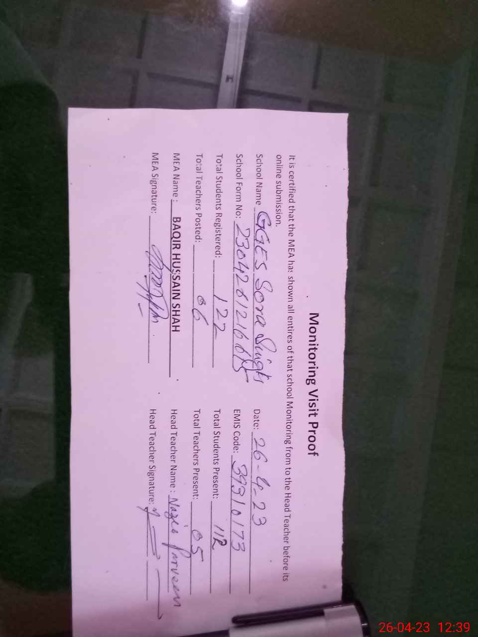 | Attendance Register | Head Teacher | MEA with School | Visit Proof |