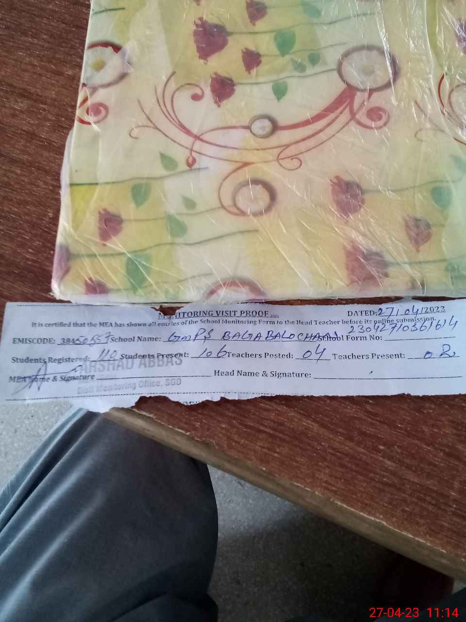 | Monitoring Date: 27-04-2023 | Start Time: 27-04-2023 10:56 AM | End Time: 27-04-2023 11:15 AM | Name of MEA: AR**** AB**** | |