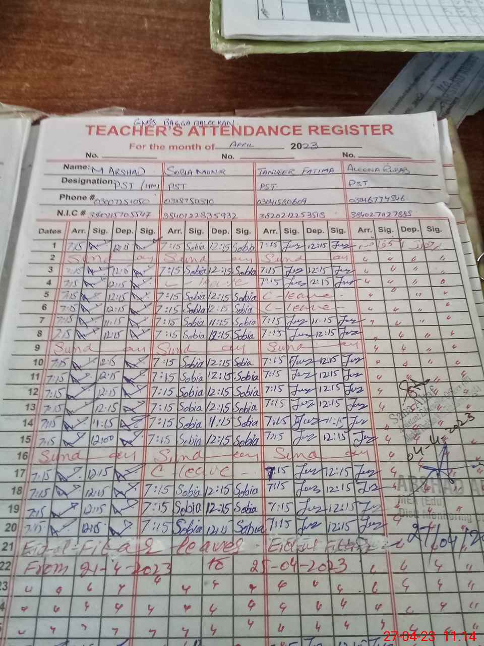 | CNIC | Full Name | Designation | R/C | Absence During Last Calender Month |