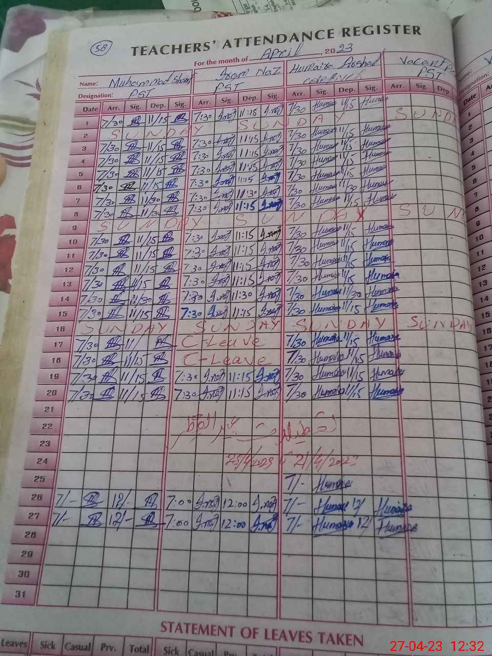 | Name: Mu**** Sh**** Designation: (School Headmaster's/Headmistress's) PST Phone/Cell Number: 03**** |