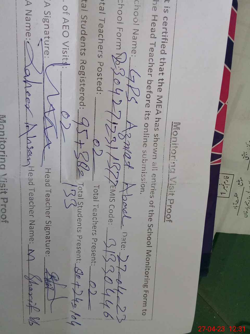 | Attendance Register | Head Teacher | MEA with School | Visit Proof |