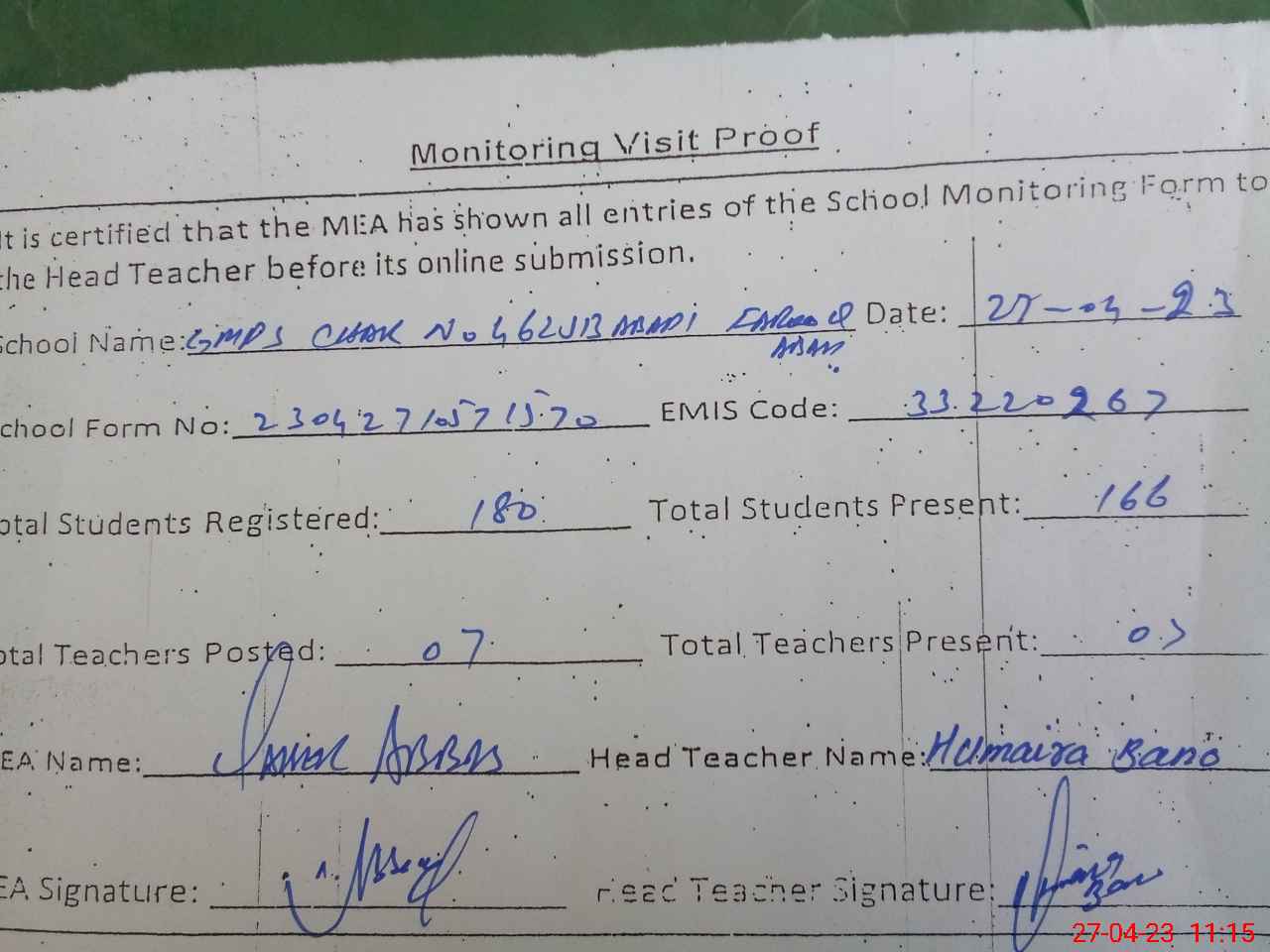 | Attendance Register | Head Teacher | MEA with School | Visit Proof |