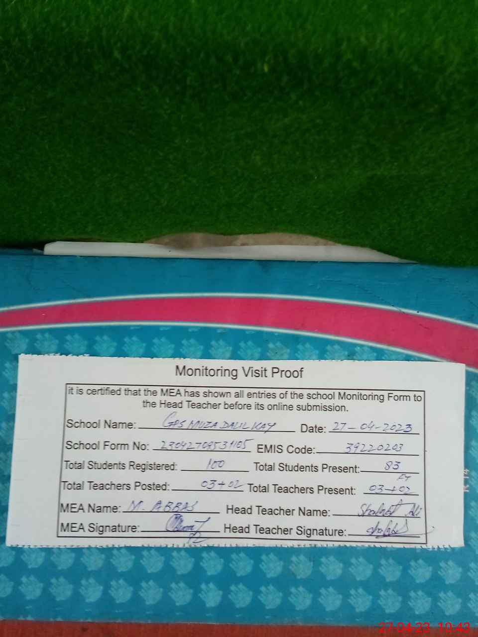 | Attendance Register | Head Teacher | MEA with School | Visit Proof |