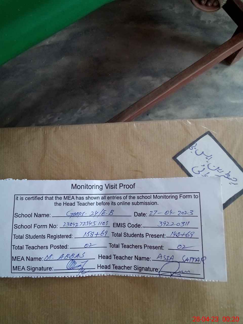 | Attendance Register | Head Teacher | MEA with School | Visit Proof |