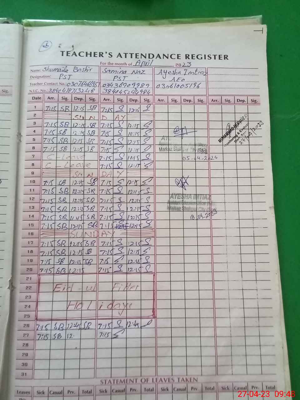 | Name: SA**** NA**** Designation: (School Headmaster's/Headmistress's) PST Phone/Cell Number: 03**** |
