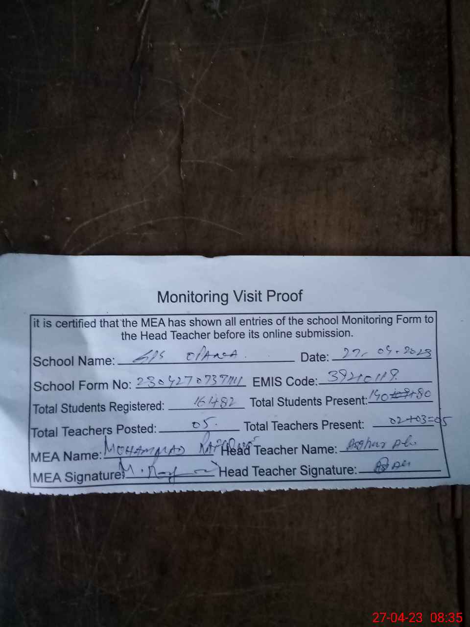 | Attendance Register | Head Teacher | MEA with School | Visit Proof |