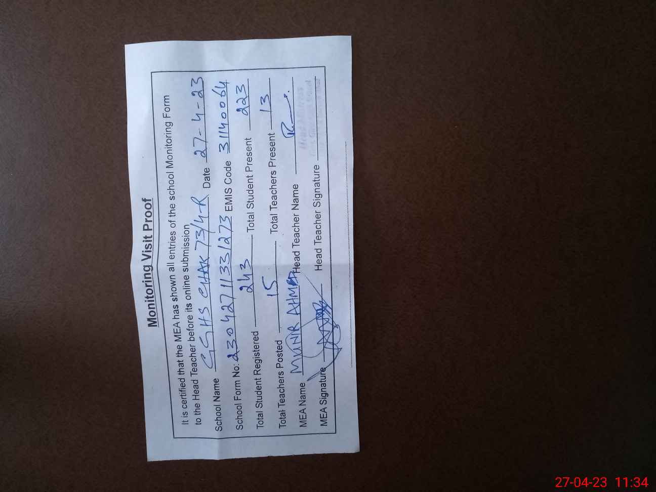 | Attendance Register | Head Teacher | MEA with School | Visit Proof |